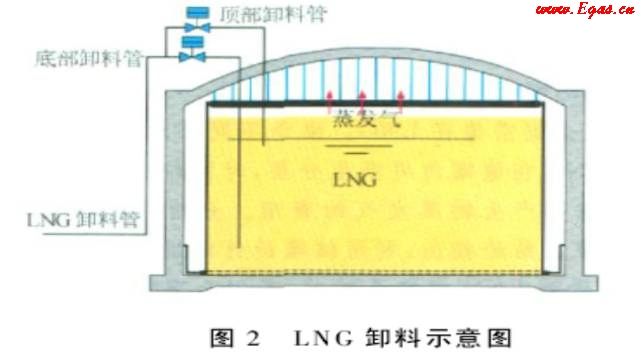 卸船時(shí),當(dāng)船上的LNG密度比儲(chǔ)罐內(nèi)LNG密度重時(shí),從頂部卸料管進(jìn)罐。反之,從底部卸料管進(jìn)罐,這樣可以促進(jìn)不同密度的LNG在儲(chǔ)罐內(nèi)自行混合,消除分層。