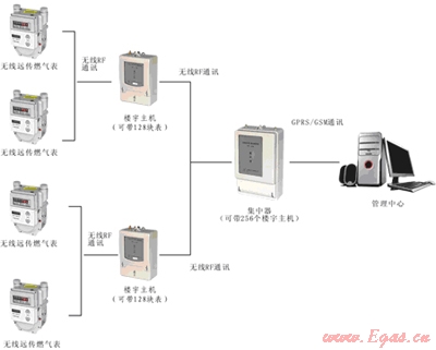 IC卡無線遠(yuǎn)傳燃?xì)獗淼臄?shù)據(jù)可由無線方式自動(dòng)上傳給樓宇主機(jī),樓宇主機(jī)通過無線方式把數(shù)據(jù)傳給集中器,集中器通過GPRS/GSM網(wǎng)絡(luò)把數(shù)據(jù)傳給燃?xì)夤镜腎C卡無線遠(yuǎn)程抄表系統(tǒng)中,由此實(shí)現(xiàn)在管理中心自動(dòng)抄錄所有的燃?xì)獗頂?shù)據(jù)。