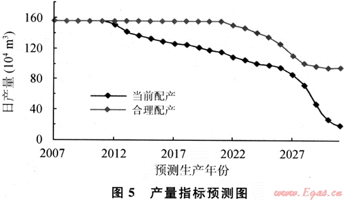 數(shù)值模擬計(jì)算結(jié)果顯示,動(dòng)態(tài)合理配產(chǎn)方案的穩(wěn)產(chǎn)期由目前配產(chǎn)的4a增加到14a(圖5);模擬生產(chǎn)25a,累計(jì)產(chǎn)量增加20×108m3,采出程度提高8%;由于關(guān)閉了高出水井,整個(gè)開采階段的出水量大大降低。