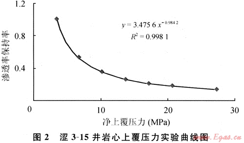 澀3-15井巖心上覆壓力實(shí)驗(yàn)(圖2)表明,至氣藏廢棄時(shí),儲(chǔ)層滲透率將降至原始值的1/5~1/2。