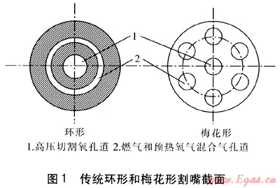 氧氣在切割中主要有兩個(gè)作用:①作預(yù)熱火焰的助燃?xì)怏w,這部分氧氣稱為預(yù)熱氧;②使金屬燃燒并將燃燒生成的熔渣排除,這部分氧氣稱為高壓切割氧。傳統(tǒng)切割用割炬的割嘴形式主要有環(huán)形和梅花形兩種[1]。環(huán)形割嘴主要由內(nèi)嘴和外嘴兩部分組合而成,又稱組合式割嘴。梅花形割嘴與環(huán)形不同,燃?xì)夂皖A(yù)熱氧的混合氣孔道呈小圓孔,均勻地分布在高壓切割氧孔道周?chē)?,整個(gè)割嘴為一體,又稱整體式割嘴。傳統(tǒng)環(huán)形和梅花形割嘴截面見(jiàn)圖1。
