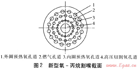 由于不同燃?xì)饩哂胁煌男再|(zhì),若在原來(lái)的氧-乙炔割嘴上直接使用丙烷來(lái)進(jìn)行氣割,就會(huì)有火焰分散無(wú)力、氣割速度緩慢、點(diǎn)火困難、不易調(diào)節(jié)的缺點(diǎn)。因此必須設(shè)計(jì)專用的氧-丙烷氣割割嘴才能滿足氣割要求。丙烷的熱值比乙炔高,丙烷的燃燒溫度比乙炔的燃燒溫度低。需要重新調(diào)整可燃?xì)怏w與氧氣的比例,降低丙烷-氧氣混合氣體的噴出速度,才能保證良好的燃燒。
