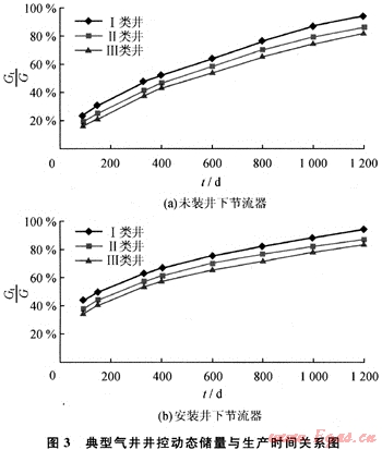 氣井在各生產(chǎn)階段的單位套壓降產(chǎn)氣量的變化規(guī)律直接反映了氣井井控動(dòng)態(tài)儲(chǔ)量隨生產(chǎn)時(shí)間變化的規(guī)律。采用FAST.RTA軟件對(duì)這些氣井進(jìn)行動(dòng)態(tài)分析,求得不同生產(chǎn)時(shí)間的井控動(dòng)態(tài)儲(chǔ)量(Gt),發(fā)現(xiàn)Gt-t與Gt/△pc2-t有相同的變化規(guī)律,Gt在早期隨生產(chǎn)時(shí)間t增加而快速增大,后期逐漸趨緩變平,兩者之間呈良好的二次多項(xiàng)式關(guān)系;當(dāng)Gt不再隨生產(chǎn)時(shí)間增大時(shí),可認(rèn)為已達(dá)到了最大井控動(dòng)態(tài)儲(chǔ)量,記為Gt歸納這些氣井的Gt/G-t關(guān)系,可得到3類典型氣井井控動(dòng)態(tài)儲(chǔ)量隨生產(chǎn)時(shí)間變化的關(guān)系圖版。在研究過程中發(fā)現(xiàn)氣井的生產(chǎn)制度對(duì)井控動(dòng)態(tài)儲(chǔ)量的變化規(guī)律有較大影響,氣井初始配產(chǎn)越高,其初始階段的井控動(dòng)態(tài)儲(chǔ)量和泄流面積越小。蘇里格早期投產(chǎn)井大部分未安裝井下節(jié)流器,初始配產(chǎn)較高,而近年來投產(chǎn)的氣井普遍采用了井下節(jié)流技術(shù),初始配產(chǎn)較低(圖3)。