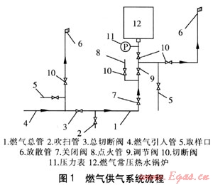 燃?xì)夤庀到y(tǒng)流程見(jiàn)圖1。燃?xì)夤艿涝谕V惯\(yùn)行進(jìn)行檢修時(shí),為檢修工作安全,需要管道內(nèi)的燃?xì)獯祾吒蓛?。系統(tǒng)在較長(zhǎng)時(shí)間停止工作后再投入運(yùn)行前,也需要進(jìn)行吹掃。因此,在鍋爐房供氣系統(tǒng)設(shè)計(jì)中,應(yīng)設(shè)置吹掃和放散管道。放散管出口應(yīng)高出屋脊2m以上。由鍋爐房外部引入的燃?xì)饪偣埽谶M(jìn)口處應(yīng)裝設(shè)燃?xì)饪偳袛嚅y,按燃?xì)饬鲃?dòng)的方向,閥前應(yīng)裝放散管,并在放散管上裝設(shè)取樣口,閥后應(yīng)裝吹掃管。為保證鍋爐安全可靠運(yùn)行,要求供氣管和其他管道上安裝的附件連接嚴(yán)密可靠,能承受最高使用壓力,且不得裝設(shè)在高溫和有危險(xiǎn)的地方[3、4]。