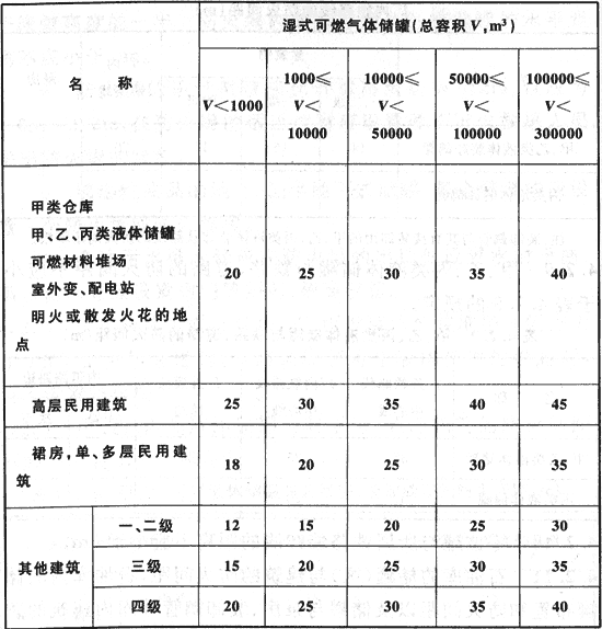 1 濕式氧氣儲罐與建筑物、儲罐、堆場等的防火間距不應(yīng)小于表4.3.3的規(guī)定。