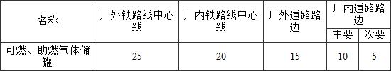4.3.6 可燃、助燃?xì)怏w儲罐與鐵路、道路的防火間距不應(yīng)小于表4.3.6的規(guī)定。
