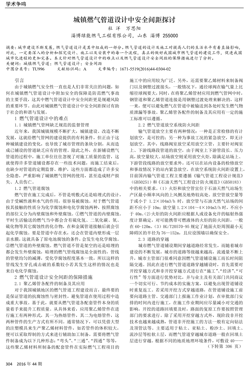 由于城鎮(zhèn)燃氣安全性一直也是人們非常關(guān)注的問題, 如何在城鎮(zhèn)燃氣管道設計中附加安全的保障是防范燃氣事故的主要手段, 這其中燃氣管道設計中安全間距更是規(guī)避風險的重要環(huán)節(jié)。 由此對城鎮(zhèn)燃氣管道設計中安全間距探討有助于社會的和諧與發(fā)展。