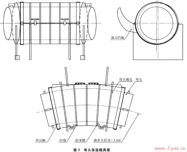 彎頭模具采用占為5mm的鋼板卷制而成,制成蝦米腰狀,見圖3。