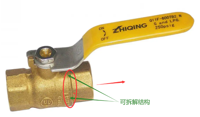 如果上述的球閥安裝方向分正反的話,那這種常見的球閥我想是不是也該按紅色箭頭安裝方向進(jìn)行安裝。因?yàn)橛覀?cè)也是一個(gè)可拆解的結(jié)構(gòu)(猜測(cè)很難拆解,但維修過閥門的都知道,另外閥門本體此處泄漏的可能性有多少?)。