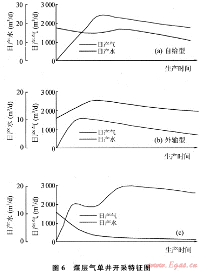 自給型:氣體從本井降壓解吸半徑之內(nèi)從本井產(chǎn)出。排采井一般處于構(gòu)造平緩部位,層內(nèi)均質(zhì)性強(qiáng)。日產(chǎn)氣量經(jīng)歷上升-穩(wěn)產(chǎn)-遞減3個(gè)階段;相對應(yīng)地,日產(chǎn)水量經(jīng)歷下降-平穩(wěn)-遞減3個(gè)階段(圖6)。
