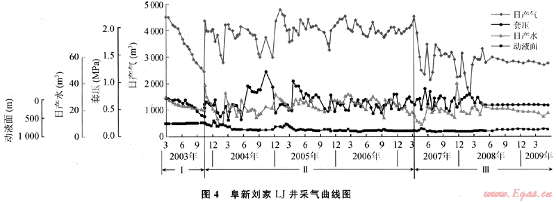 阜新劉家區(qū)塊LJ井2003年投產(chǎn)(圖4),初期日產(chǎn)氣4500m3,穩(wěn)產(chǎn)4a開始遞減,目前日產(chǎn)氣2780m3,已累計(jì)采出662×104m3,采出程度26.6%,預(yù)計(jì)采收率50%。解吸類型劃分為阻礙解吸(高液面)、暢通解吸、低飽和解吸3個(gè)階段。①阻礙型解吸:解吸速率大于降壓速率,氣泡變形,解吸困難;②暢通型解吸:解吸速率接近降壓速率,氣泡帶出部分束縛水,產(chǎn)量理想;③低飽和解吸:解吸速率小于降壓速率,應(yīng)力閉合。從中國目前煤層氣開采現(xiàn)狀分析,直井第一階段一般小于1a;第二階段井距為300m×300m一般可采4~6a,與井距、煤厚和排采速度等有關(guān);第三階段開采時(shí)間較長,羽狀水平井穩(wěn)產(chǎn)階段更短,為1~3a。