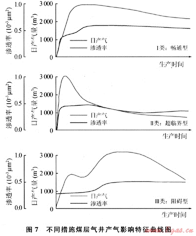 暢通型解吸:降壓速率接近解吸速率,日產(chǎn)氣上升-相對穩(wěn)產(chǎn)-遞減;滲透率隨開采的束縛水、氣產(chǎn)出上升-穩(wěn)定,開采效果最佳(圖7)。