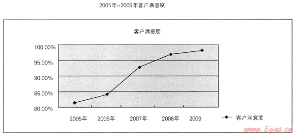 (2) 重慶燃氣集團按照客戶滿意度測評表的項目和內容進行客戶滿意度測評,測評數據均由客服系統自動生成。2005年-2009年客戶滿意度分別為:81.8%、84.3%、93%、97%、98.18%。