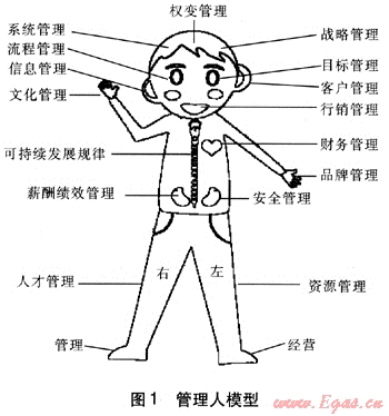 現(xiàn)代市場經(jīng)濟下的企業(yè)管理,就是帶有知識經(jīng)濟、網(wǎng)絡(luò)經(jīng)濟、信息經(jīng)濟色彩的企業(yè)管理,就是對技術(shù)、信息的把握,帶有中西方文化大融合特色對人的管理。各種管理理論都是管理學家站在不同角度,用不同語言解讀企業(yè)可持續(xù)發(fā)展規(guī)律的不同層次。而管理人模型(見圖1)就是以人為模板,按照人的幾大系統(tǒng)相互協(xié)作,以人的大腦指揮著兩只腳向目標前進為基礎(chǔ)。確立“一個腦袋兩只腳”的管理人模型,就是具有戰(zhàn)略思維的“大腦”,指揮著圍繞市場活動的“經(jīng)營左腳”,圍繞企業(yè)內(nèi)部的“管理右腳”,帶動企業(yè)這個法人不停地向前走。