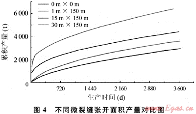 采用相同的輸入?yún)?shù),微裂縫張開面積分別假設(shè)為0m2、150m2(1m×150m,天然微裂縫張開范圍為裂縫長(zhǎng)度方向150m,垂直裂縫方向1m,以下同),2250m2(15m×150m),4500m2(30m×150m),裂縫孔隙度為0.12%,微裂縫滲透率為800μm2。圖4給出了不同微裂縫張開面積下的累積產(chǎn)量隨時(shí)間的變化曲線。