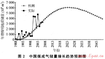 煤成氣儲(chǔ)量增長預(yù)測參數(shù)選?。篈=4500,C=12,x=3,T0=1988。