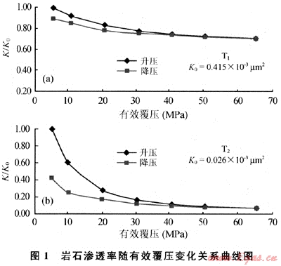 圖1是采用CMS300測得的低滲透巖石滲透率與有效覆壓關(guān)系曲線。從圖1可看出:①巖樣初始滲透率(K0’越低,滲透率在有效覆壓增加的過程中的下降幅度越大;②滲透率在有效覆壓增大的初始階段下降幅度最大,覆壓降低后滲透率不能完全恢復,說明巖樣在實驗過程中發(fā)生了微量的軟塑性變形。)