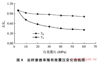 T6(K0’=12.62×10-3μm2,φ0=14.8%)和T7(K0’μm2,φ0=3.7%)是孔滲參數(shù)差=0.079×10-3異較大的兩塊巖樣。從巖樣的孔徑分布圖與覆壓滲透率變化曲線(圖5、6)可以看出:對于低孔低滲透巖樣,小孔徑占了絕大多數(shù),在覆壓實驗中,小孔道一旦受到壓縮發(fā)生塑性變形就會嚴重喪失滲流功能,導致巖樣的滲透率大幅下降,表現(xiàn)出較強的應力敏感性。