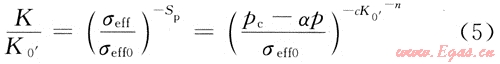 大量實驗數(shù)據(jù)表明:與指數(shù)式相比,這種表達式與實驗數(shù)據(jù)有更好的相關(guān)性(多數(shù)相關(guān)系數(shù)超過0.99)。目前常規(guī)巖樣孔滲都是在地面低圍壓條件下所測得,利用式(5)一方面可將巖樣常規(guī)滲透率轉(zhuǎn)換成原始儲層條件下的滲透率,對原始儲層物性作出正確評價,另一方面可以計算儲層滲透率在開發(fā)過程中的動態(tài)變化規(guī)律,具有實際的工程應用價值。