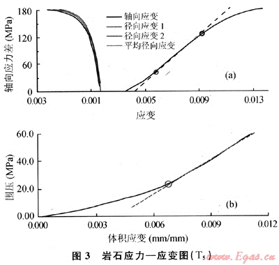 圖3是采用三軸巖石力學測試系統(tǒng)得到的巖石應力-應變關(guān)系曲線。從圖3-a可以看出:在應力增大的初始階段,巖石發(fā)生的變形較大,有一定軟塑性變形,隨著軸向應力增大(超過30MPa),逐漸過渡到穩(wěn)定的彈性變形階段,超過彈性極限后,巖石進入塑性變形階段,最終破壞失穩(wěn)。從圖3-b則可以更明顯地看出巖石在圍壓增大的初始階段變形較大,整個變形過程不是線彈性變形過程。