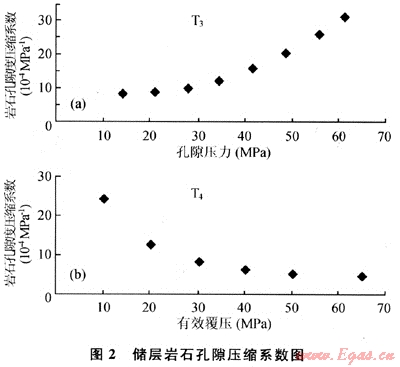 圖2是采用增加圍壓與降低孔隙壓力兩種方法所測得的巖石孔隙壓縮系數(shù)與應力的關(guān)系曲線。從圖2中可以看出是變化值而非固定值,初始值很高,隨著圍壓增大、孔隙壓力減小,下降很快,圍壓、孔隙壓力達到一定值后,變化不大,保持穩(wěn)定,這表明在實驗過程中巖石發(fā)生的并非理想的線彈性變形。