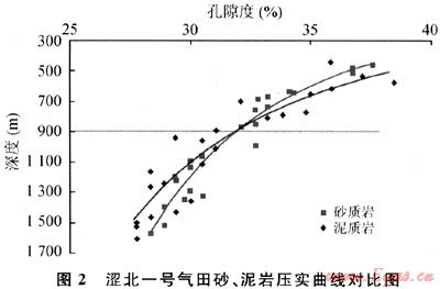 壓實作用是沉積物最重要的成巖作用之一,它導(dǎo)致孔隙水排除,孔隙度減少,巖石體密度增加。三湖地區(qū)第四系地層主要的成巖作用是壓實作用,不同巖性其壓實特征不盡相同。研究表明,壓實早期對泥巖的影響較對砂巖顯著,0~2000m深度范圍內(nèi),頁巖的孔隙度隨深度的變化速率相對較大,而砂巖的變化速率相對較小,在相同深度范圍內(nèi),泥質(zhì)巖物性變化的速率總比砂質(zhì)巖性大(圖2)。特別是深度超過900m,由于地層水的大量排出,泥巖塑性消失,已相當(dāng)致密且明顯成層;粉砂巖已趨于點接觸,但是膠結(jié)物較少,仍較疏松。泥質(zhì)巖壓實程度超過砂質(zhì)巖,兩者排替壓力差逐漸增大,泥巖層易形成側(cè)向封堵,有利于巖性氣藏形成。