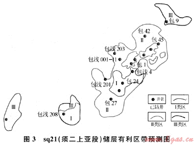 在對(duì)sq21(須二上亞段)進(jìn)行儲(chǔ)層分類評(píng)價(jià)時(shí),以儲(chǔ)能系數(shù)大于1、0.5~1、小于0.5分布作為Ⅰ、Ⅱ、Ⅲ儲(chǔ)層的分類依據(jù),以區(qū)塊內(nèi)是否有獲得工業(yè)油氣流井作為分類的劃分標(biāo)準(zhǔn)。Ⅰ類有利區(qū)位于鼻狀構(gòu)造上,儲(chǔ)層發(fā)育好,儲(chǔ)能系數(shù)大于1,且有工業(yè)氣流井;Ⅱ類有利區(qū)位于鼻狀構(gòu)造上,儲(chǔ)層發(fā)育較好,儲(chǔ)能系數(shù)為0.5~1,且有工業(yè)氣流井;Ⅲ類有利區(qū)位于鼻狀構(gòu)造之外,但儲(chǔ)層較發(fā)育,儲(chǔ)能系數(shù)在0.5~1。綜合評(píng)價(jià)出Ⅰ類有利區(qū)4個(gè),Ⅱ類有利區(qū)2個(gè),Ⅲ類有利區(qū)3個(gè)。Ⅰ類有利區(qū)塊位子包22井-包24井-包淺4井區(qū)、包21-包1-包淺001-6井區(qū)、包33井-包16井-包45井井區(qū)、包淺208井區(qū);Ⅱ類較有利區(qū)塊位于包淺201-包27井區(qū)、包淺203-包淺001-11井區(qū)、包42井區(qū)(圖3)。