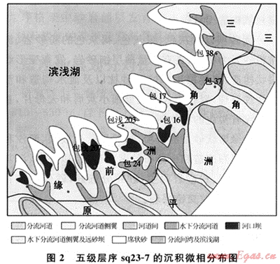 確定重點(diǎn)五級(jí)層序,進(jìn)行儲(chǔ)層精細(xì)刻畫(huà),對(duì)sq13-6、sq21-4、sq21-6、sq23-3、sq23-7、sq31-4、sq31-7、sq33-2、sq33-7等9個(gè)重點(diǎn)含氣的五級(jí)層序進(jìn)行了儲(chǔ)層的精細(xì)刻畫(huà)。以五級(jí)層序sq23-7為例(圖2),其沉積沉積物源主要來(lái)自工區(qū)南部及東南部方向,區(qū)內(nèi)發(fā)育三角洲平原水上分流河道、河道間洼地,三角洲前緣水下分流河道、河口壩、遠(yuǎn)砂壩及席狀砂等沉積微相,并可精細(xì)刻畫(huà)出河道主體與河道側(cè)翼。河包場(chǎng)氣田主要處于水下分流河道、河口壩砂體主體發(fā)育帶。分流河道砂巖厚度在10m以上;河口壩砂巖厚度為8~10m,其發(fā)育位置包括包淺207-包淺205井區(qū)、包淺201井區(qū)、包4井區(qū)、包46井區(qū)等。遠(yuǎn)砂壩的砂巖厚度一般為2~4m,分布在河口壩前端,由于受湖水的改造而形成的席狀砂呈帶狀分布,二者呈過(guò)渡關(guān)系,不易區(qū)分。