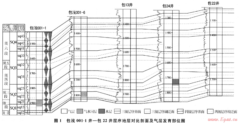 三級(jí)層序(SQ1~SQ4)的層序界面為不整合面或大型沖刷侵蝕面。層序界面在地震剖面中表現(xiàn)為削截與上超等反映地層不協(xié)調(diào)關(guān)系的地震反射,代表區(qū)域性的侵蝕間斷或無(wú)沉積型的間斷[2~4]。SQ1底界為須一段與下部嘉陵江組五段白云巖或雷口坡組二段石灰?guī)r的超覆不整合面。SQ4頂界為須六段與上部地層自流井不整合接觸面。SQ2、SQ3、SQ4的底界分別為發(fā)育于須二、須四、須六段大套砂巖內(nèi)部的大型沖刷侵蝕面[5~6],其主要特征為:①底部存在礫石或者泥礫,礫石有時(shí)有定向排列,有時(shí)雜亂無(wú)章,這種泥礫層在剖面上可連續(xù)追蹤,自然伽馬曲線呈箱形或鐘形,底部呈突變接觸關(guān)系;②發(fā)育大規(guī)模的起伏不平的侵蝕面,侵蝕底面明顯下切到先前的沉積體中,下切深度一般為1m左右;③有時(shí)存在風(fēng)化形成的黏土層或者菱鐵礦結(jié)核,此類現(xiàn)象出現(xiàn)在水上暴露的環(huán)境中;④有時(shí)存在大規(guī)模的植物莖干的堆積并且與其他巖性混雜在一起,此類現(xiàn)象一般發(fā)育在水下環(huán)境中的相對(duì)靜水湖灣地帶等;⑤有時(shí)發(fā)生物源的改變,比如由石英巖屑砂巖突變?yōu)殚L(zhǎng)石巖屑砂巖,由于長(zhǎng)石遭受風(fēng)化而在露頭剖面上形成一個(gè)松軟帶。