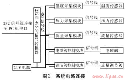 電路設(shè)計(jì)要根據(jù)測(cè)試系統(tǒng)中所選用的儀器儀表來進(jìn)行。溫度測(cè)量采用德國原產(chǎn)溫度傳感器與變送器,Pt100精度等級(jí)1/3B,4線制;溫度測(cè)量范圍為0~150℃,具有響應(yīng)時(shí)間短、測(cè)量精度高等特點(diǎn),輸出信號(hào)4~20mA。流量測(cè)量采用德國原產(chǎn)ProcessMaster系列電磁流量計(jì)、五點(diǎn)標(biāo)定后精度為0.2%。電磁流量計(jì)根據(jù)法拉第電磁感應(yīng)定律設(shè)計(jì),流量正比于介質(zhì)流速和磁通密度,以及電極間的距離。電壓信號(hào)用變送器轉(zhuǎn)換成標(biāo)準(zhǔn)信號(hào),方便數(shù)據(jù)采集,而且電磁流量計(jì)無節(jié)流部件,壓力損失小,減少能耗,只與被測(cè)流體的平均速度有關(guān),測(cè)量范圍寬。只需經(jīng)水標(biāo)定后即可測(cè)量其他介質(zhì),無須修正,相比于浮子流量計(jì)精度大大提高。壓力測(cè)量采用德國原產(chǎn)壓力傳感器,測(cè)壓范圍為0~3MPa,精度為0.15%,輸出標(biāo)準(zhǔn)電流信號(hào)。燃?xì)庀牧繙y(cè)量采用日本品川濕式氣體流量計(jì),既可以通過流量計(jì)的機(jī)械表盤讀取燃?xì)庀牧?,也可以通過其發(fā)出的電信號(hào)經(jīng)過處理后得到燃?xì)庀牧?。燃?xì)鈮毫y(cè)量用壓力表量程為0~5kPa,輸出相應(yīng)的電信號(hào)進(jìn)行數(shù)據(jù)采集。流量調(diào)節(jié)閥選用電動(dòng)調(diào)節(jié)閥,進(jìn)行遠(yuǎn)程控制。煙氣分析儀采用多組分煙氣分析儀,各組分都有對(duì)應(yīng)的電信號(hào)輸出。數(shù)據(jù)采集模塊選用ADAM系列模塊對(duì)各參數(shù)進(jìn)行高精度采集與控制。系統(tǒng)電路連接見圖2。