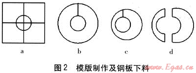 ③ 將剪好的工程紙?zhí)兹肴細(xì)夤艿溃采w到套管上,用錘子垂直擊打工程紙,得到管道與套管之間圖形的壓環(huán)模版,見圖2c。