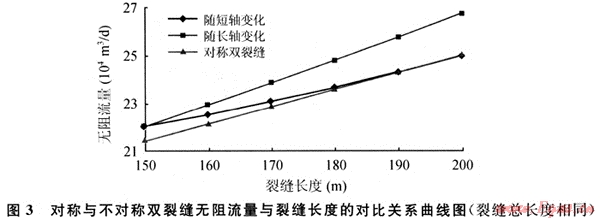 根據(jù)不對稱裂縫產能模型,分別計算了壓裂不對稱單裂縫與雙裂縫氣井的產能,從圖3可以看出,隨著裂縫長度的增加,裂縫控制的泄氣面積不斷增大,壓裂不對稱單裂縫與雙裂縫氣井的產能均不斷增加,但是隨長軸變化下的無阻流量增加的幅度要大一些。