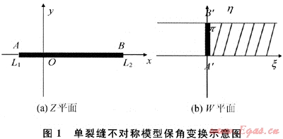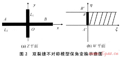 如圖1所示,采用保角變換函數(shù)將Z平面上建立的x-y不對稱裂縫坐標系轉化為W平面車ε-η坐標系,可用于描述儲層不對稱裂縫的流動形態(tài)對壓裂后產能的貢獻。