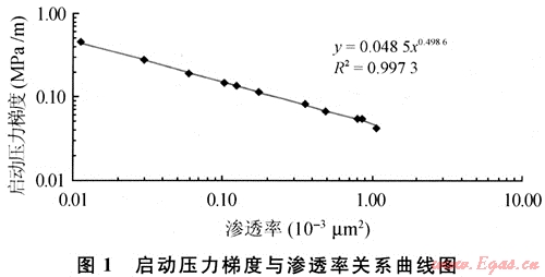 經(jīng)對(duì)11塊全直徑巖樣的室內(nèi)實(shí)驗(yàn)表明,儲(chǔ)層滲透率對(duì)啟動(dòng)壓力梯度[3]有明顯的影響,隨著巖石空氣滲透率的降低,啟動(dòng)壓力梯度增大(圖1)。
