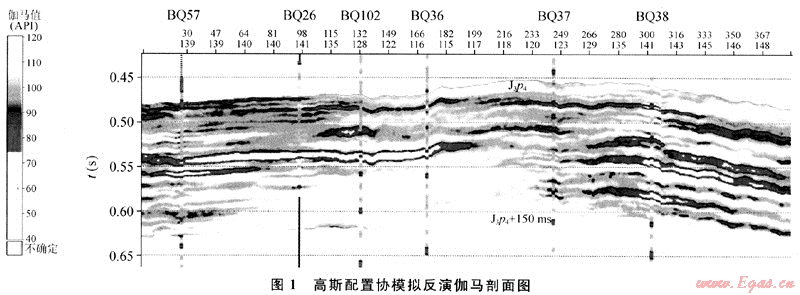 由于統(tǒng)計(jì)了多井點(diǎn)樣本數(shù)據(jù)的地質(zhì)、地震特性,在儲層屬性建模中進(jìn)行約束,這優(yōu)化了對儲層的模擬。從利用該模塊反演的過井Gamma剖面看,其整體面貌好,但個別井始終對應(yīng)不好(如BQ36井)。