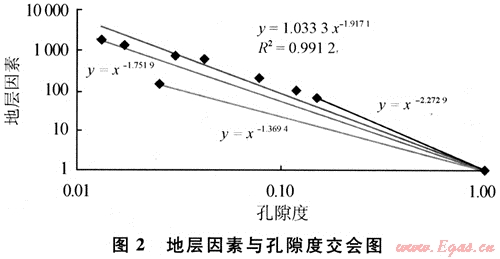 根據(jù)地層因素與孔隙度交會(huì)圖(圖2),研究區(qū)a平均取值為1.033,仇平均取值為1.92。