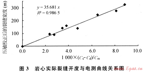 巖心實(shí)際裂縫開度(經(jīng)壓敏校正)與電測(cè)值關(guān)系(圖3)表明:A=3.5×104,比理論值高,說明工區(qū)低角度縫很少。當(dāng)出現(xiàn)低角度縫且Cs<Cd時(shí),公式中的(Cs-Cd)換成(Cd-Cb),其中,Cb為基巖塊電導(dǎo)率,從與解釋層鄰近的非裂縫性地層讀取,裂縫愈發(fā)育,側(cè)向測(cè)井比基質(zhì)電阻率降得愈低。