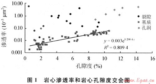 徐深氣田火山巖儲(chǔ)層野外露頭觀測(cè)發(fā)現(xiàn),構(gòu)造裂縫和原生收縮縫普遍發(fā)育[2~3]。根據(jù)巖心的宏觀和微觀統(tǒng)計(jì),該區(qū)裂縫以高角度斜交裂縫和垂直裂縫為主,所占比例分別為35%和45%;低角度裂縫和水平裂縫發(fā)育程度較低,只占16%和4%。巖心觀測(cè)表明,在2804條裂縫市有62.8%是開啟的,裂縫張開度平均值0.1mm。利用全直徑巖心分析數(shù)據(jù),建立巖心滲透率和巖心孔隙度交會(huì)圖(圖1),圖版中明顯低孔、高滲的點(diǎn)代表裂縫發(fā)育,為裂縫發(fā)育區(qū)。巖心觀測(cè)和分析表明:徐深氣田火山巖儲(chǔ)層為裂縫-孔隙型儲(chǔ)層。