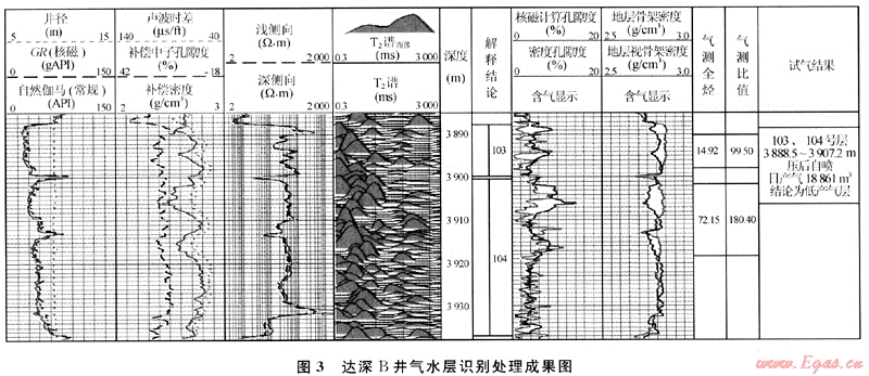 圖3是達(dá)深B井流體識(shí)別處理成果圖,巖性為玄武巖。從圖中可以看到,試氣層段應(yīng)用核磁共振判別法的密度孔隙度與核磁計(jì)算孔隙度有明顯幅度差,應(yīng)用雙密度重疊法也見明顯含氣反映,且錄井氣測(cè)比值較大,綜合分析判別該層為氣層。實(shí)際試氣結(jié)果表明,3888.0~3907.0m井段壓后日產(chǎn)氣18851m3,與測(cè)井識(shí)別結(jié)果一致。