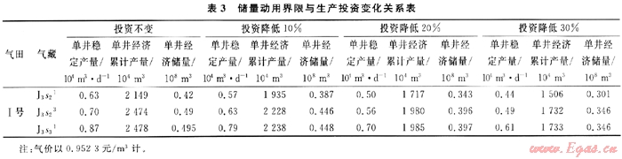 儲量動用的技術界限值(邊際值)不但與油氣價敏感,而且與投資成本也密切相關。在一定的范同內(nèi)適當降低生產(chǎn)投資費用,利于難動用儲量開發(fā)經(jīng)濟效益的提高。表3為研究選用的Ⅰ號氣田儲量動用界限與生產(chǎn)投資變化關系表,由表3可算出投資降低20%時,儲量動用邊際值降低20%~22%。而當氣價由0.9523元/m3上浮至1.143元/m3(也上浮20%時),儲量動用邊際值降低16%~17%,相比之下儲量動用的技術界限值與投資成本更敏感。因此,在分析難動用儲量的可動用性時是應該油氣價格和投資兩方面的經(jīng)濟因素都要考慮。