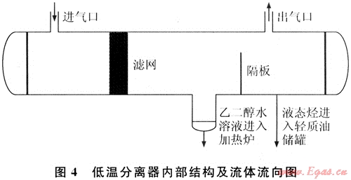 在低溫分離器中分離出來的液相經(jīng)過重力分離后,密度較小的液態(tài)烴從隔板頂部進入儲油器,當液位達到設定值,液位控制法就會自動打開,使液態(tài)烴排出進入儲油罐。低溫分離器內(nèi)部結構見圖4[5]。
