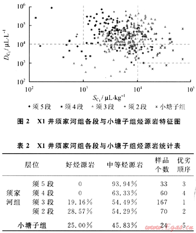 X1井粉砂質(zhì)頁(yè)巖、頁(yè)巖、碳質(zhì)頁(yè)巖和煤層全部分布于須家河組和小塘子組。根據(jù)標(biāo)準(zhǔn)發(fā)現(xiàn)須5段和須4段以中等烴源巖為主,無(wú)好烴源巖;須3段、須2段和小塘子組以中等烴源巖為主,好烴源巖相對(duì)豐富(圖2)。根據(jù)好烴源巖與中等烴源巖之和對(duì)烴源巖優(yōu)劣進(jìn)行排序,認(rèn)為須3段最優(yōu)、須2段其次、須5段和須4段較差、小塘子組最差(表2)。此認(rèn)識(shí)與劉華等2002年對(duì)四川盆地上三疊統(tǒng)有機(jī)碳含量的研究成果相符[3]。