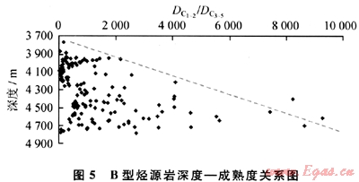 對(duì)于同類型烴源巖,其DC1~2/DC3~5或者DC1/DC4~5隨著深度的增大(或者成熟度升高)而變大(圖5),A型和C型具有同樣的變化趨勢(shì)。