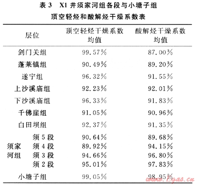 另外,一般烴類從烴源巖到儲(chǔ)層或者蓋層的運(yùn)移,如無(wú)外源加入,甲烷運(yùn)移速度最快,總會(huì)在運(yùn)移路徑上呈干燥系數(shù)變大的特點(diǎn)。但是X1井干燥系數(shù)在須家河組各段和小塘子組從下至上明顯逐漸減小。分析認(rèn)為此特征應(yīng)為烴源巖生烴作用造成,因此也可確定須家河組和小塘子組為烴源巖層(表3)。