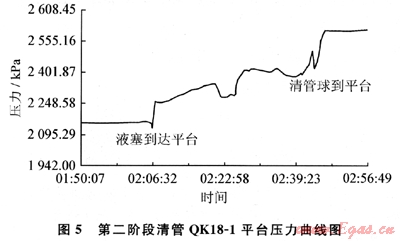 2010年2月5日開始第一階段清管,從QK18-1平臺發(fā)送專門研制的泡沫清管球,約4h后終端處理廠收到清管球,清除積液約20m3(該管道在2個月前有過清管,故積液量少于預(yù)測值)。幾天后進(jìn)行第二階段清管,從BZ13-1平臺發(fā)送清管球,710min后管道出口壓力開始上升,750min后過球指示器動作顯示清管球到達(dá)?,F(xiàn)場根據(jù)壓力曲線估計(jì)液塞段體積約150m3,QK18-1平臺壓力曲線圖如圖5所示。隨后進(jìn)入第三階段清管,再從QK18-1平臺發(fā)送清管球,經(jīng)過260min收到清管球,通過渤西油氣處理廠測算收到積液127m3,部分液體經(jīng)過QK18-1平臺處理轉(zhuǎn)入輸油管道。此次作業(yè)共清除積液約170m3,取得了輸氣管網(wǎng)清管作業(yè)的成功。