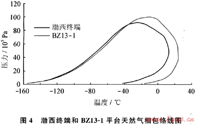 為了研究管道積液的可能性,從現(xiàn)場取得2處天然氣樣品進(jìn)行測試和計(jì)算,模擬得到天然氣的相包絡(luò)線圖如圖4所示。由圖4可知,2條管道運(yùn)行的工況點(diǎn)均在相包絡(luò)線的內(nèi)部,屬于氣液兩相區(qū),2條管道都可能積液,BZ13-1平臺天然氣的兩相區(qū)域大,BZ13-1到QK18-1海底輸氣管道的積液量應(yīng)該更多。