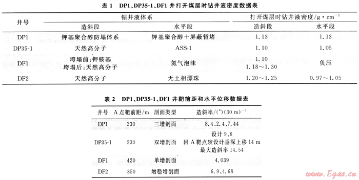 6) 調(diào)整了A點靶前距,有效降低DF2井鉆遇煤層段長。造成DF1井兩次埋鉆事故原因主要有以下幾個方面:①打開煤層時鉆井液密度不足以平衡煤層的垮塌應(yīng)力(表1為DP1井、DP35-1、DF1打開煤層時鉆井液密度數(shù)據(jù));②DF1造斜段煤層垮塌時采用倒裝鉆具組合,滑動鉆進(jìn)后變復(fù)合鉆進(jìn)時,由于鉆具撓動敲打,誘發(fā)煤層大量坍塌,造成突然坍塌埋鉆;③DF1井為長半徑水平井,A點靶前位移大,造斜率小,穿越煤層段長,累計煤層厚43m,單層最大厚度為25m(表2為DP1井、DP35-1、DF1、DF2井造斜段造斜率數(shù)據(jù))。