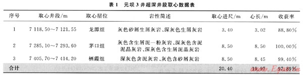 元壩3井是中國(guó)石化南方勘探開(kāi)發(fā)分公司部署的一口重點(diǎn)區(qū)域探井,完鉆井深7450m,在7000m以下二疊系龍?zhí)督M、茅口組、棲霞組Φ165.1mm小井眼中各取心一次,取心工具為川5-4取心筒,取心情況見(jiàn)表1。
