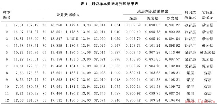 再選取學(xué)習(xí)樣本以外的12組數(shù)據(jù)作為待識別模式進行檢驗。按照2.1.2中步驟進行計算,將結(jié)果輸出(見表1)。由以上結(jié)果可見,在12組地層數(shù)據(jù)中,神經(jīng)網(wǎng)絡(luò)識別正確11組,準(zhǔn)確度達到了91.7%,實現(xiàn)了對煤層的有效識別。