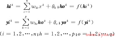 3) 計算隱含層和輸出層各節(jié)點的輸入向量hik、jik擴和輸出向量hok、yok,f(x)為傳輸函數(shù):